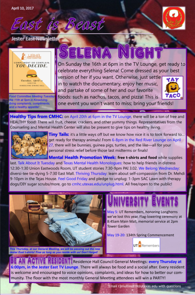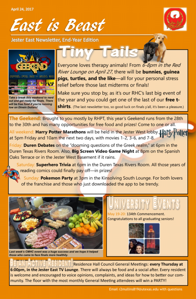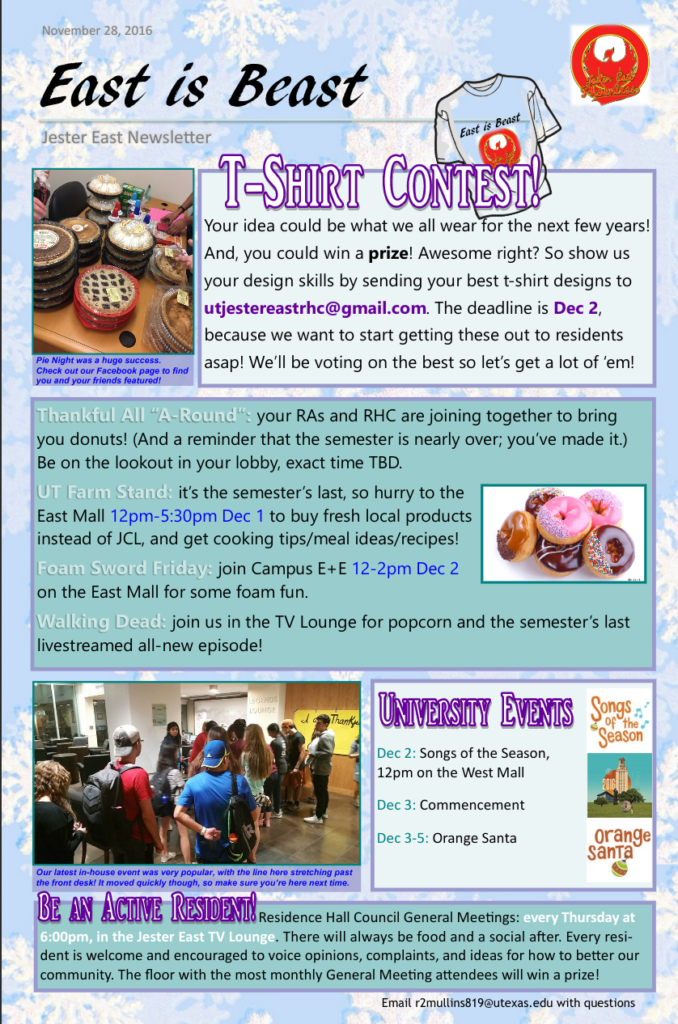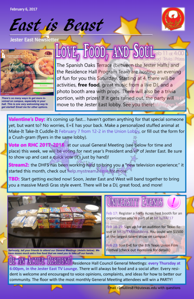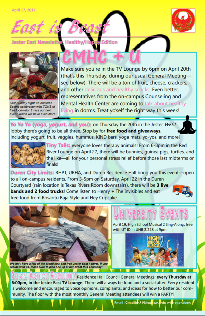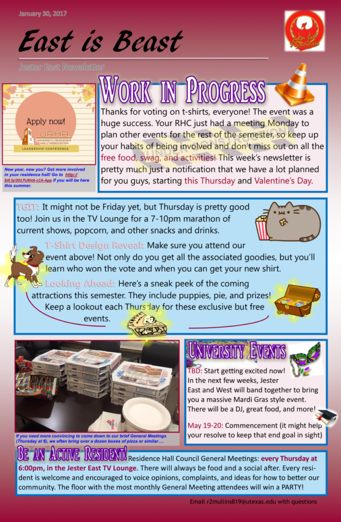However, I decided to add another duty that became wildly successful after the first week and will continue to be a Jester East tradition: a weekly publication of all the events/deadlines/happenings around Jester East and campus. As a Jester East resident I knew what residents wanted to know (and that they wanted to know it succinctly, not in a thousand posters on a bulletin board in a busy hallway), and as a Jester East Officer I had the opportunity to interview representatives from various organizations to learn what events were coming up, as well as access to a supply room and printer room.