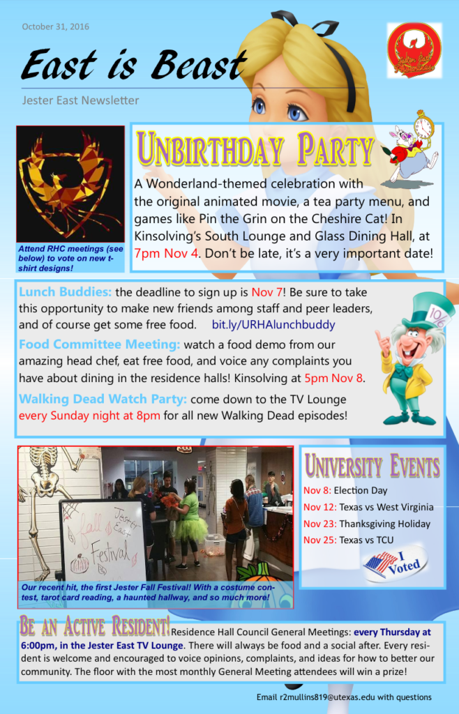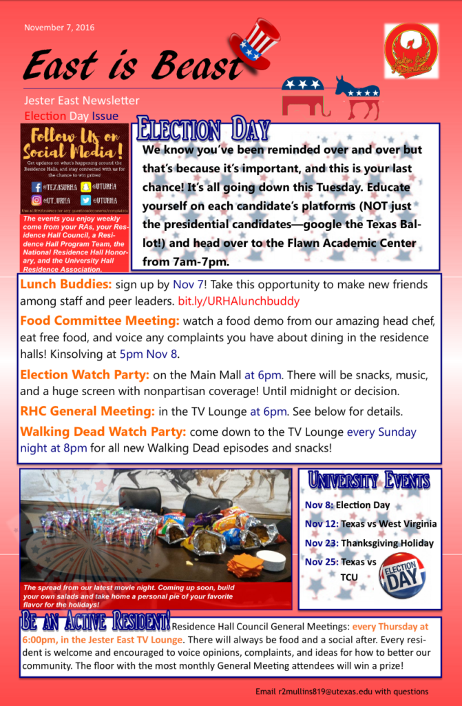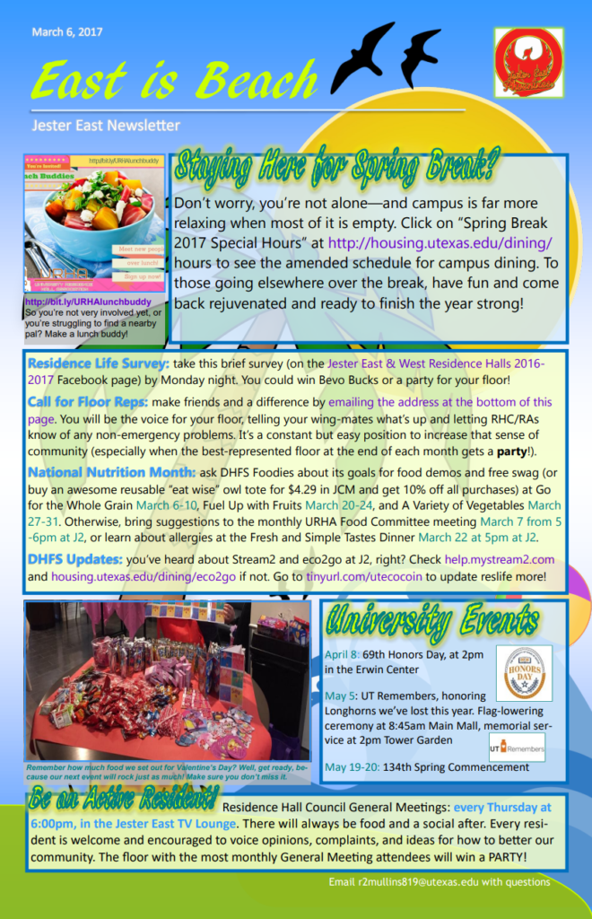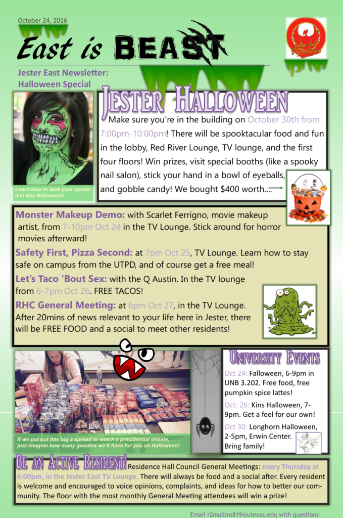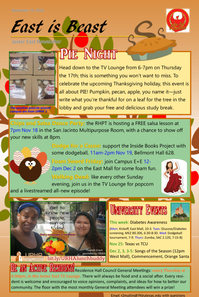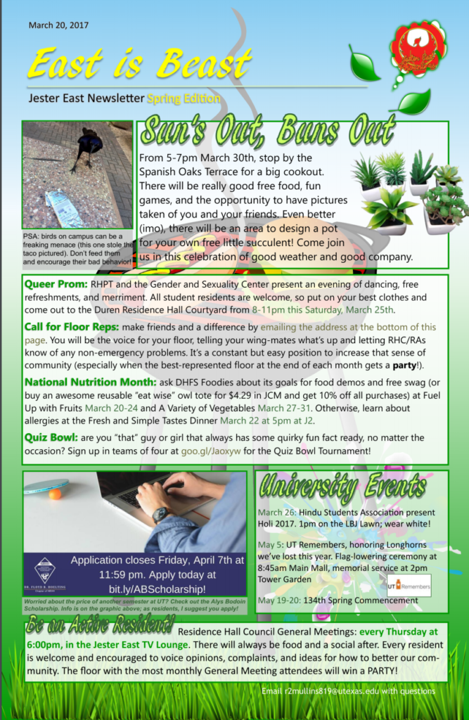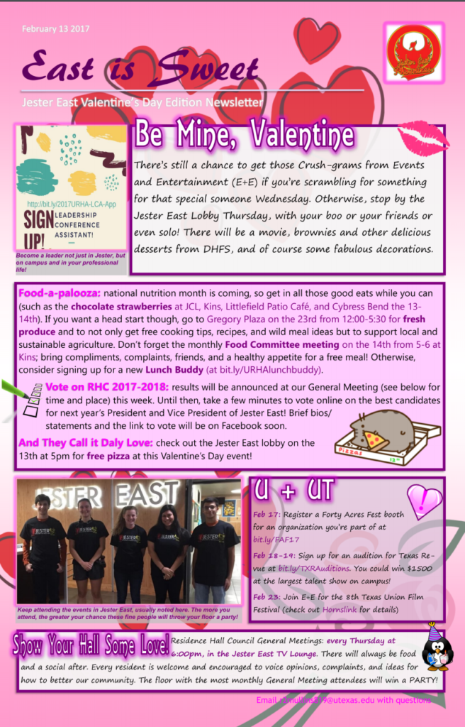 However, I decided to add another duty that became wildly successful after the first week and will continue to be a Jester East tradition: a weekly publication of all the events/deadlines/happenings around Jester East and campus. As a Jester East resident I knew what residents wanted to know (and that they wanted to know it succinctly, not in a thousand posters on a bulletin board in a busy hallway), and as a Jester East Officer I had the opportunity to interview representatives from various organizations to learn what events were coming up, as well as access to a supply room and printer room.