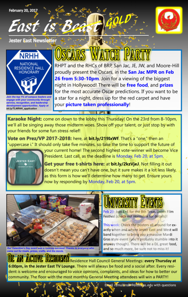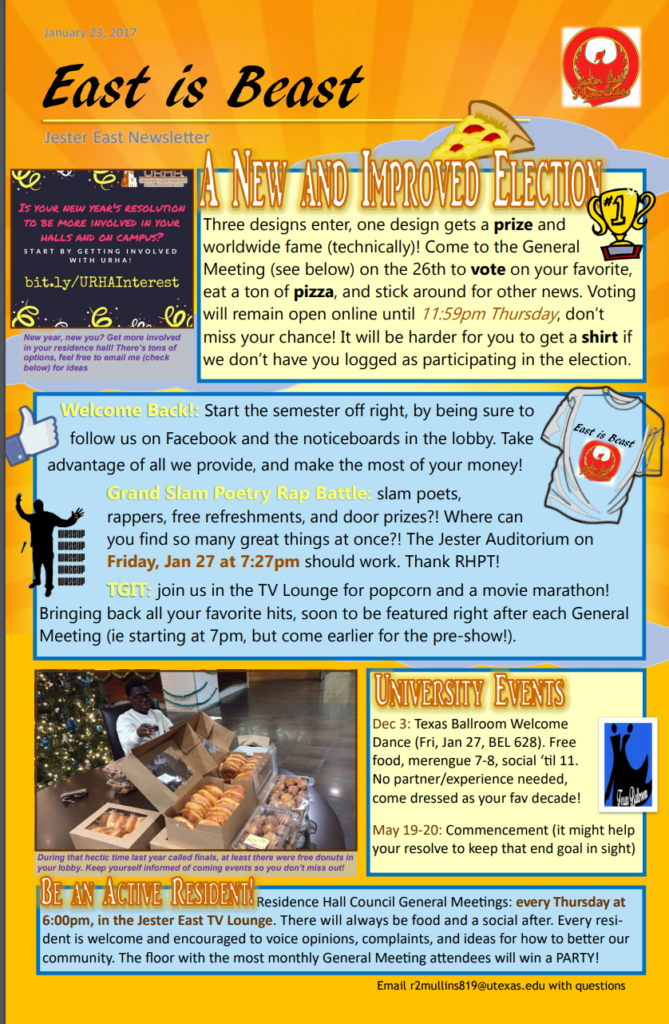 In Fall 2016 at the University of Texas at Austin, I was elected Public Relations Officer of the Jester East Residence Hall Council. My duties were initially fairly simply: requiring weekly Officer Meetings, biweekly General Meetings, biannual University Residence Hall Association meetings, and the creation and posting (physically and digitally) of various flyers/posters/cards for events around the Residence Hall.